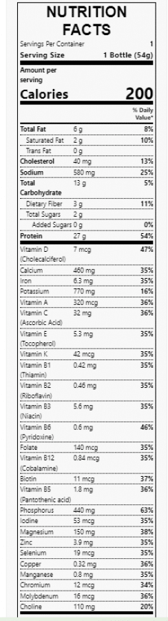 Add cold water to the fill line, replace the cap, and shake until mixed! 27 grams of protein, 200 calories, 6 grams fat, 13 grams carbohydrates. Nutritionally complete.